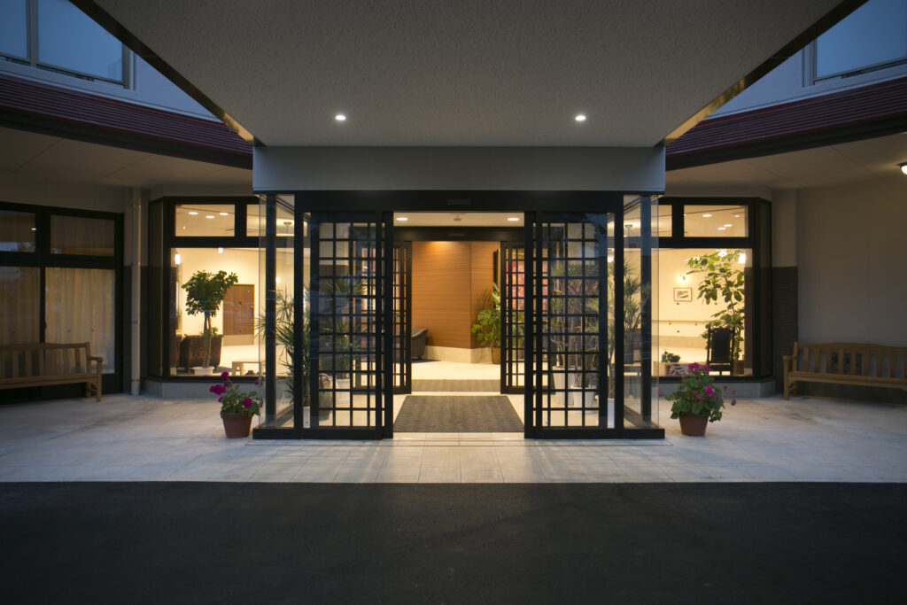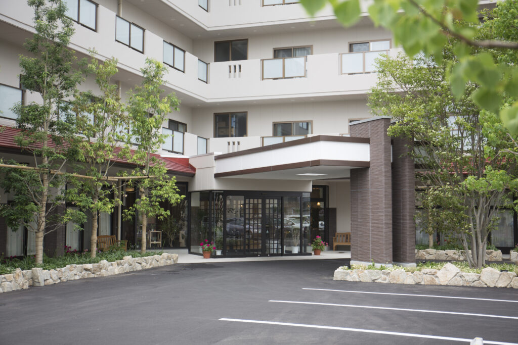 建物正面には大きな屋根付きの車寄せを設けており、雨の日でも濡れることなく乗り降りが可能。ご家族様による送迎の際も安心です。